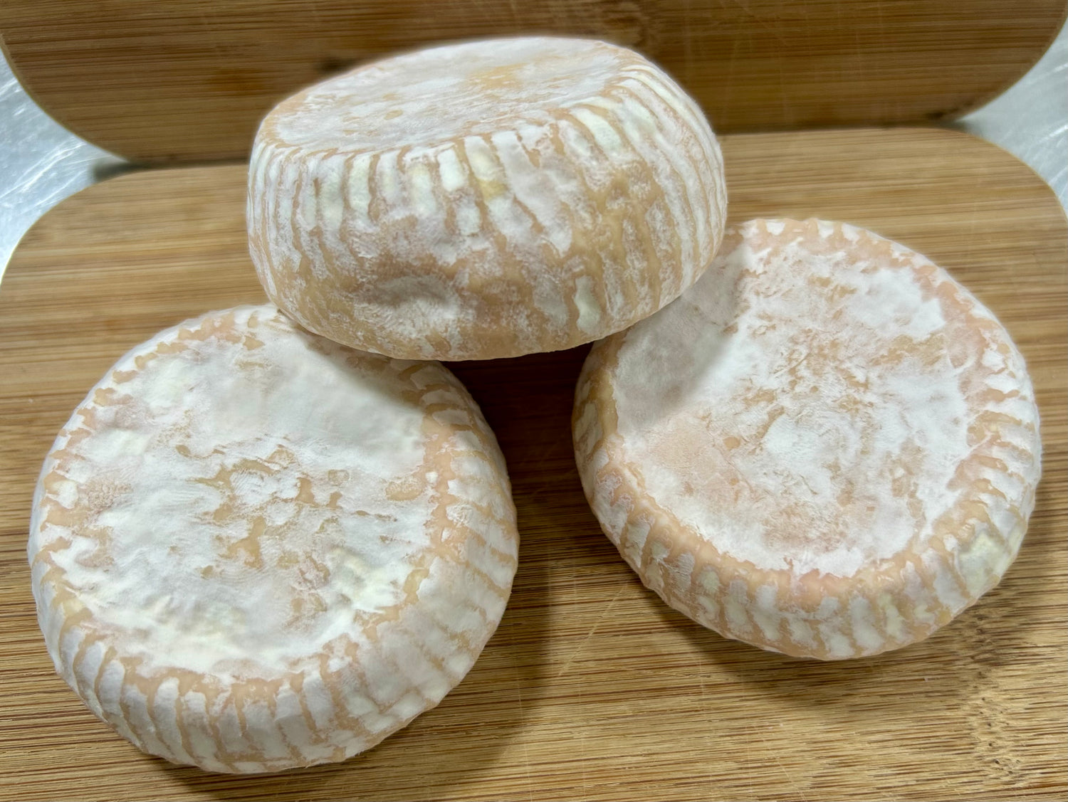 Appearance: Bloomy rind, vermiculated. Hay coloured with melting interior and white bloomy outer rind